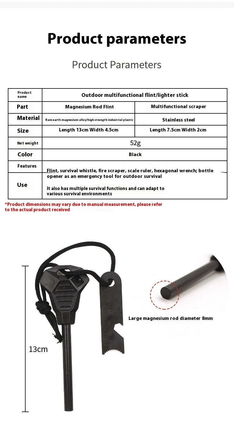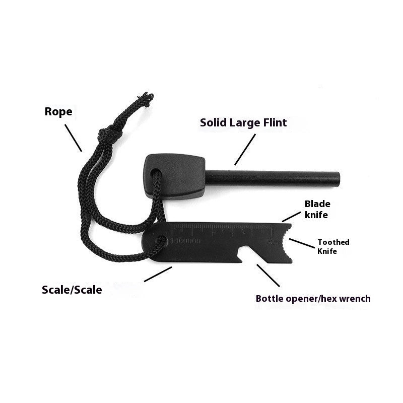 Function: flint, survival whistle, flint scraper, graduated scale, hexagonal wrench; Bottle opener